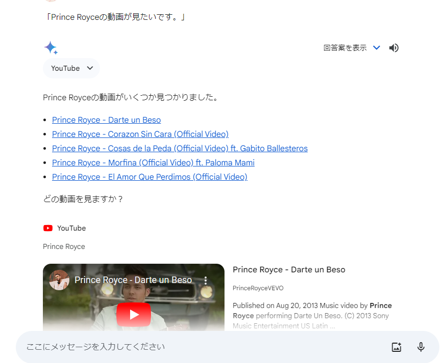 自分が見たい内容のYouTube動画を検索してもらうこともできます。以下のようなプロンプトを入力するだけでOKです。2024年2月では日本語での入力にも対応しています。