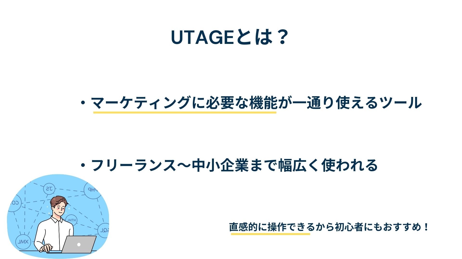 UTAGEは、マーケティング業務に必要な様々な機能が統合されたオールインワンプラットフォームです。個人事業主からスモールビジネス、中小企業まで幅広いユーザー層に利用されています。