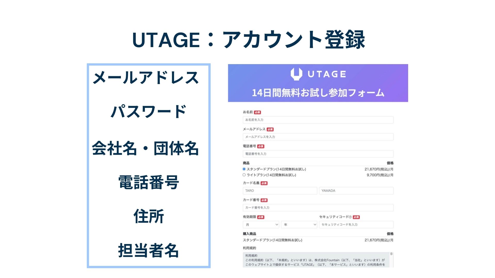 公式サイトの「今すぐ14日間無料でUTAGEを試す」ボタンから、以下の情報を入力してアカウントを作成します:
