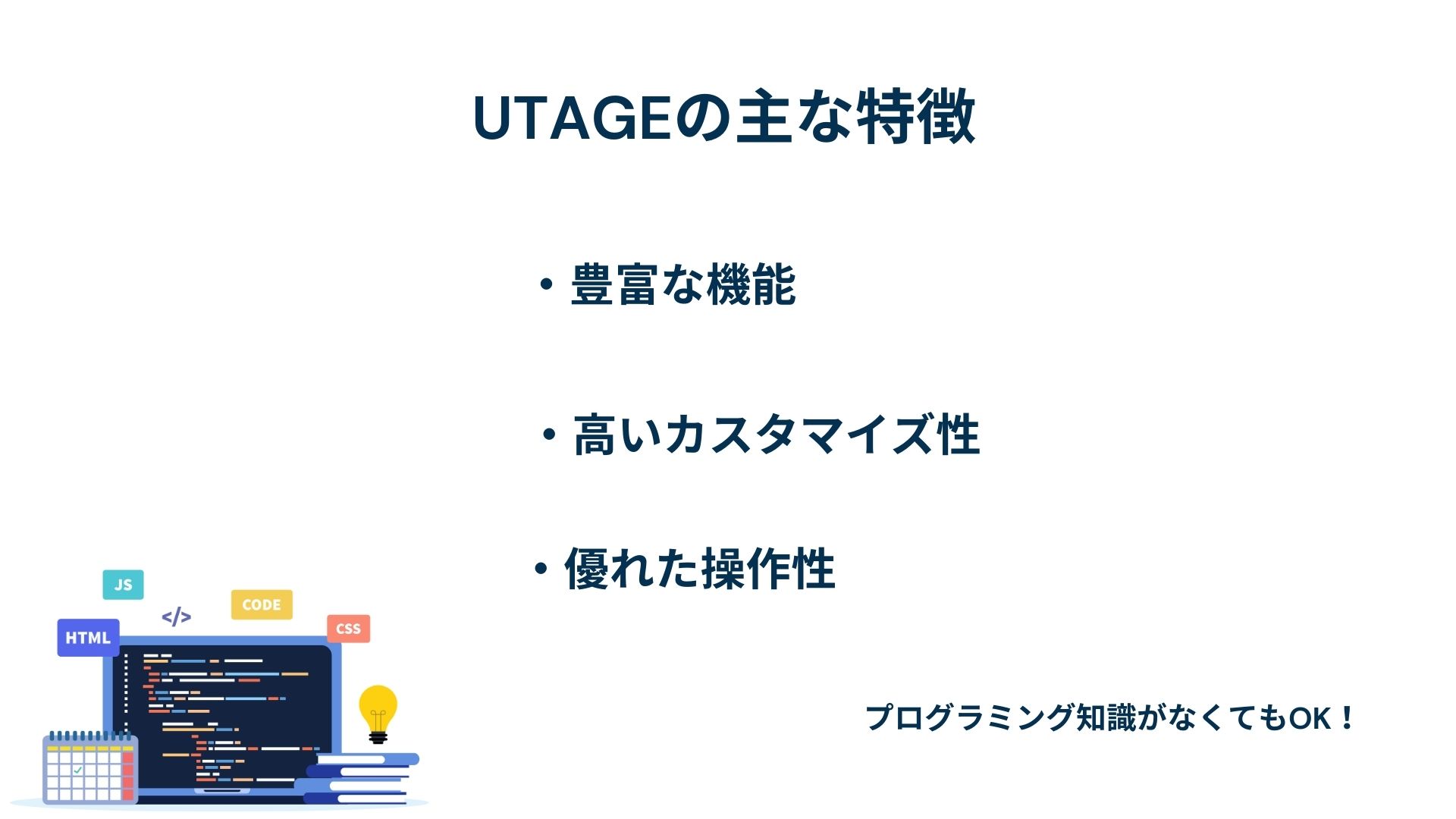 UTAGEの主な特徴は「豊富な機能」「高いカスタマイズ性」「優れた操作性」の3つに集約されます。