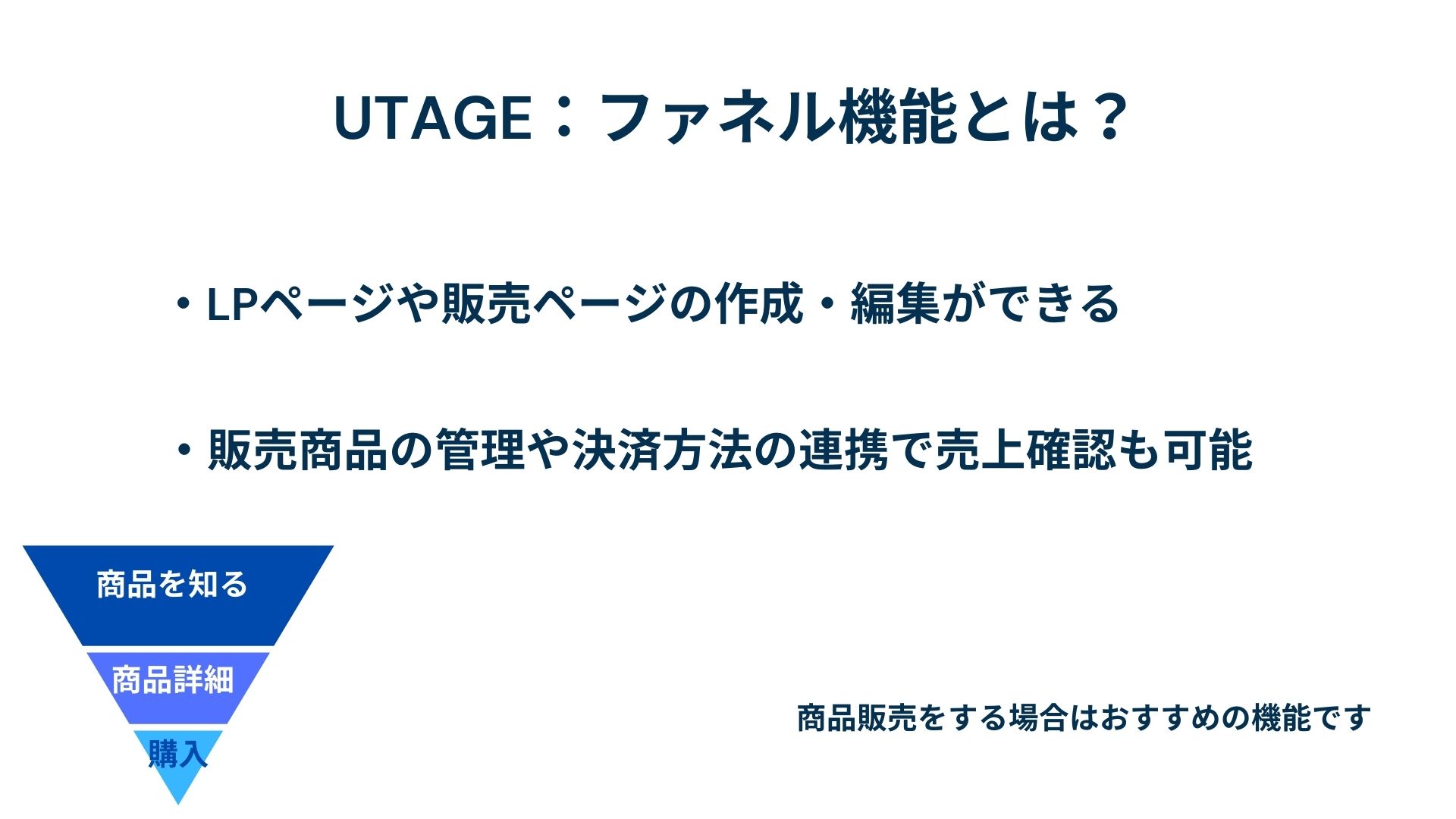 UTAGE(ウタゲ)とは、ファネル作成から自動メール配信、決済、会員サイト管理まで、マーケティングに必要な機能をオールインワンで提供するマーケティングツールです。