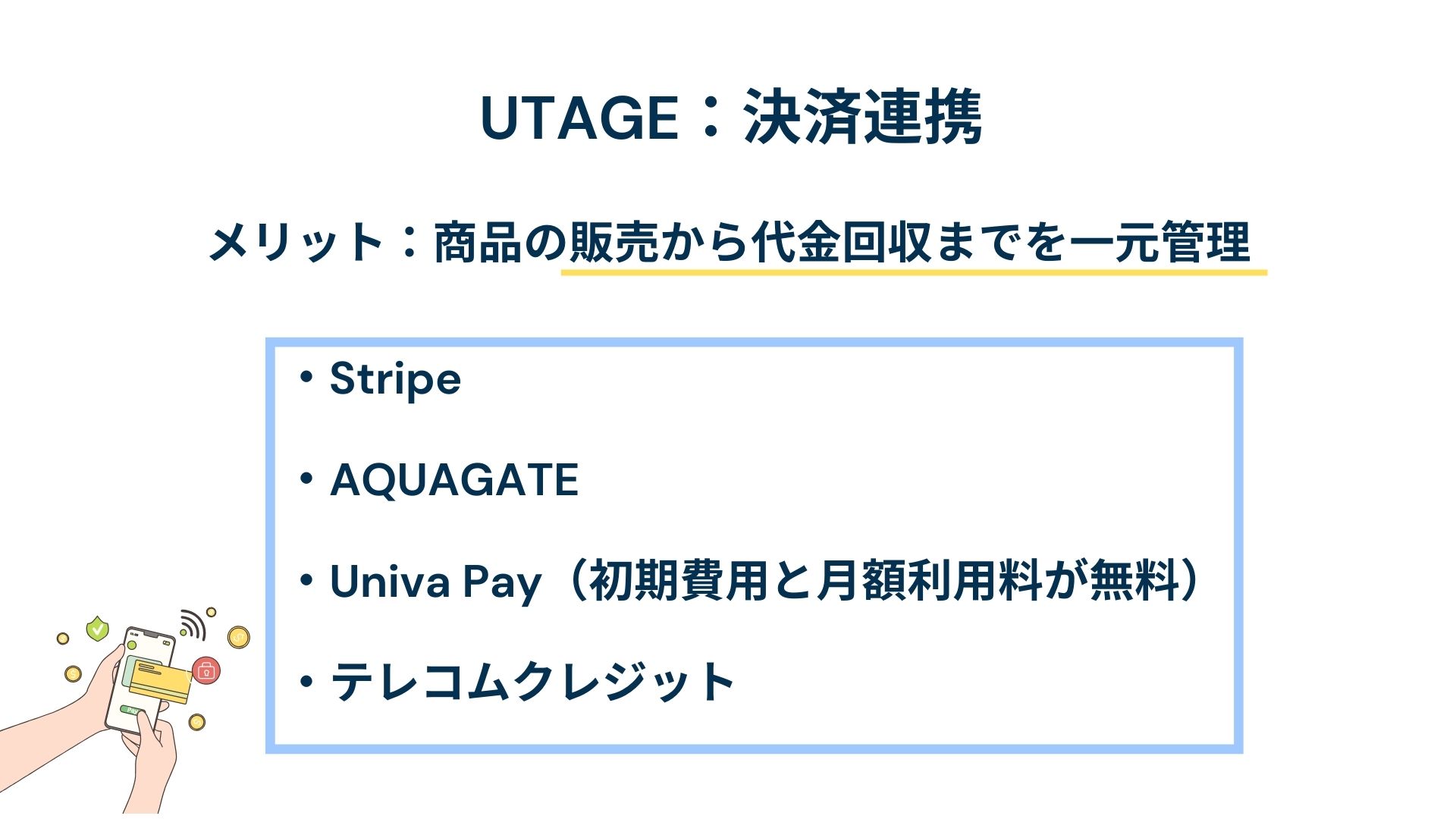 UTAGEでは、決済サービスのUniva Payと連携した場合、初期費用と月額利用料が無料になります。Univa Payの利用を検討している方は、UTAGE経由で利用することをおすすめします。