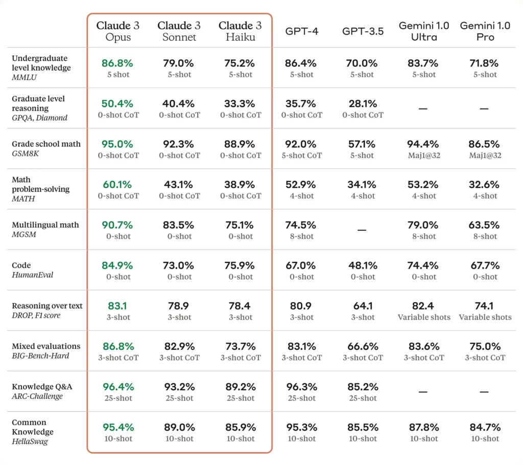 そのすべての項目において、OpusはGPT-4を上回る性能を示していることが上の表からわかります。さらにSonnetの時点でもレベルが高くプログラミングや推論能力においてChatGPT-4を超えているのも着目すべき点でしょう。