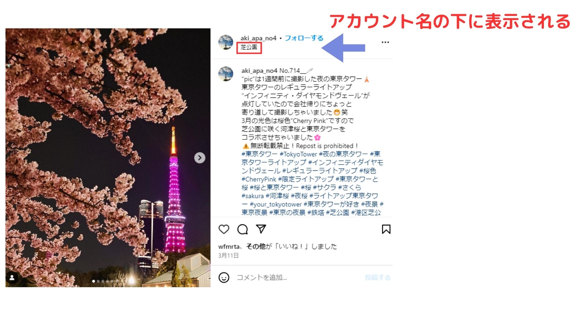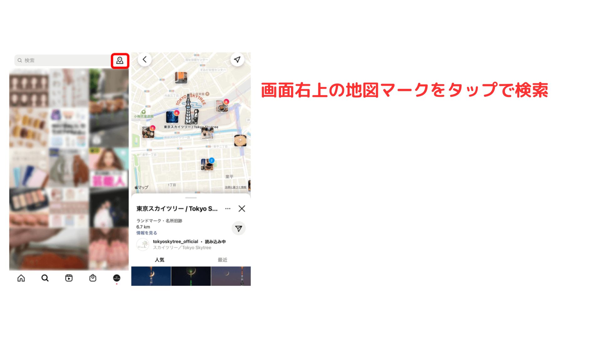 施設の名称をタップすると、Googleマップと人気の投稿が表示されます。 ある投稿に紐づけられたスポット情報をタップすることで検索できます。 位置情報は投稿画面のアカウント名の下に表示されます。