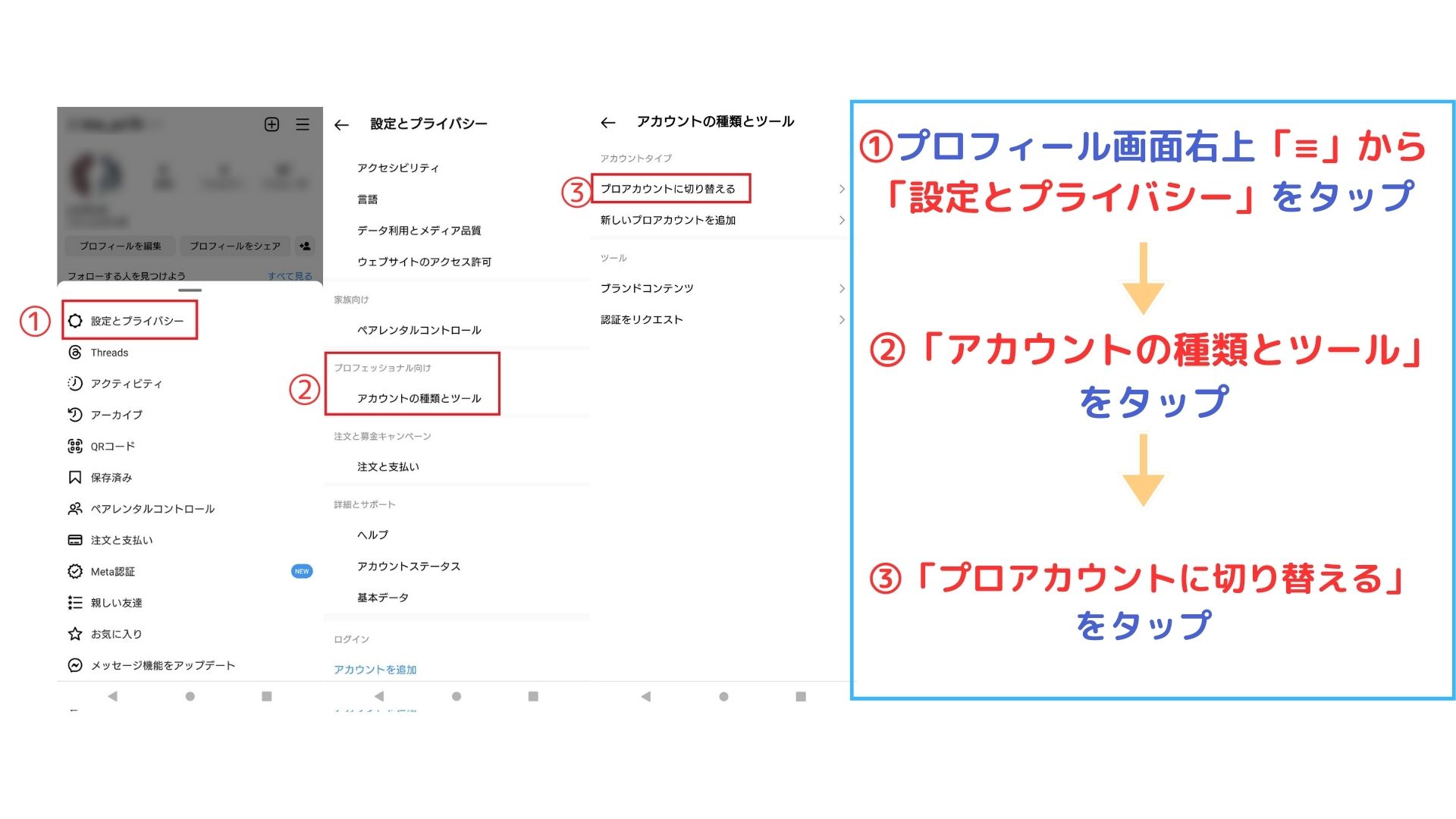 まずプロフィール画面の右上にある「≡」→「設定とプライバシー」をタップします。 次にアカウントの種類とツールをタップして、「プロアカウントに切り替える」をタップするだけです。 これでインサイト機能が使えるようになりました。