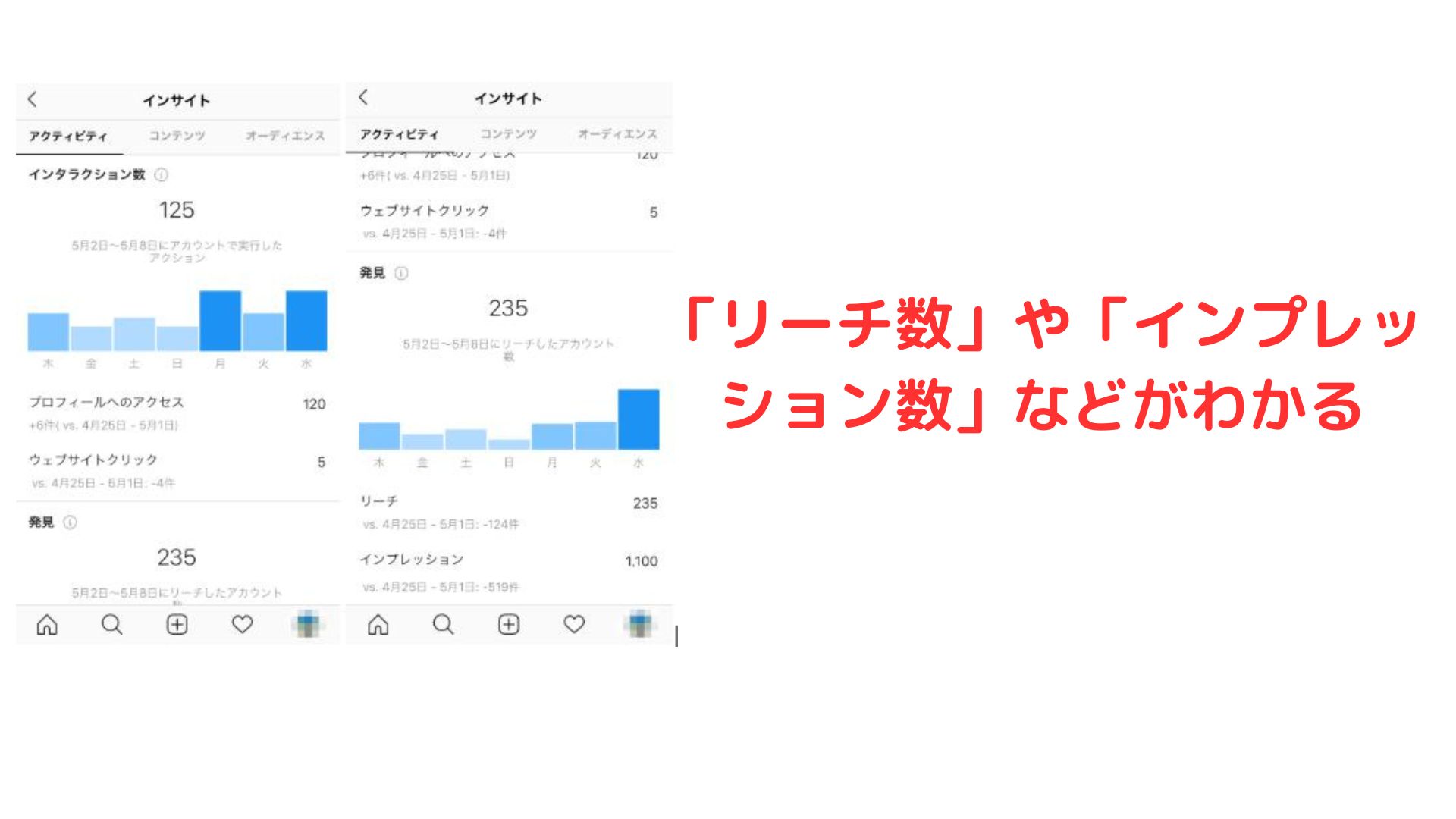インスタグラムでは、投稿ごとのインサイトもチェックできますが、アカウント全体を分析する方法もあります。 #### インスタグラムアカウントのインサイト(アクティビティ) 「アクティビティ」の項目ではInstagramアカウントへの流入やユーザーの動きを知ることができます。