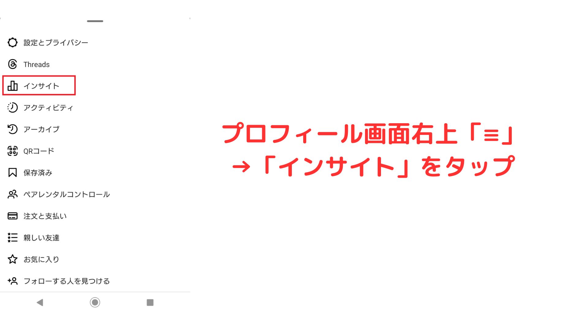 まずプロフィール画面の右上にある「≡」マークをタップして「インサイト」をタップするだけです。