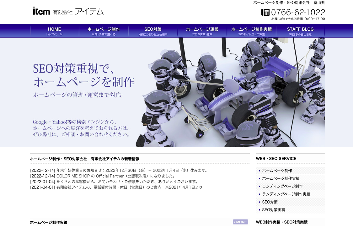 有限会社アイテムは富山県高岡市に拠点を置く、SEO対策に特化したホームページ制作会社です。2004年の設立以来、ビッグキーワードや地域名を含むキーワードでの上位表示に定評があり、300以上の企業のホームページ制作実績があります。