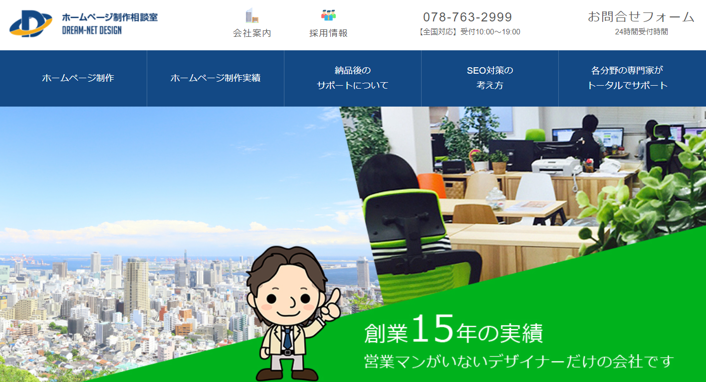 ドリームネットデザイン株式会社は自社ホームページからの受注のみで運営している、営業マンのいないSEO会社です。「ホームページ制作 相談」「ホームページ制作 神戸」「ウェブ制作 神戸」など複数の検索キーワードで1位に表示された実績もあり、安心して利用できます。