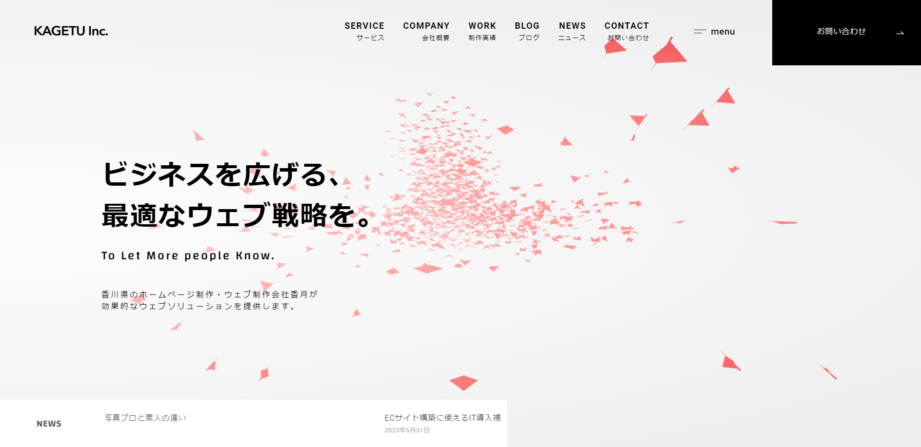 株式会社香月は香川県丸亀市にある会社です。ウェブ制作・デザイン、印刷物のデザイン、WEB広告の運用など、マーケティング・ブランディングサービスを提供しています。お客様のビジネス課題に対して、共に考え、解決に導くことをモットーにしています。SEO対策の一環として、新規制作・リニューアルの際にGoogleビジネスプロフィールの設定・連携を無料で実施しています。