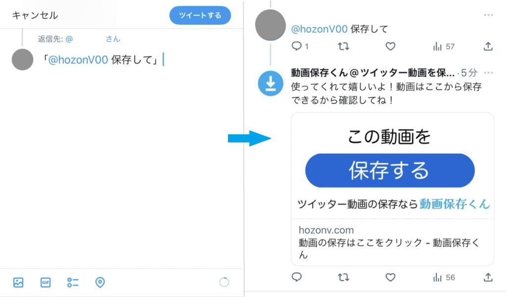 保存したいツイートに対して「@hozonV00」をメンションすると、すぐに動画をダウンロードできるリンクが返信されます。新たにアプリやツールをダウンロードする必要がないため、手軽に利用できるのが特徴です。